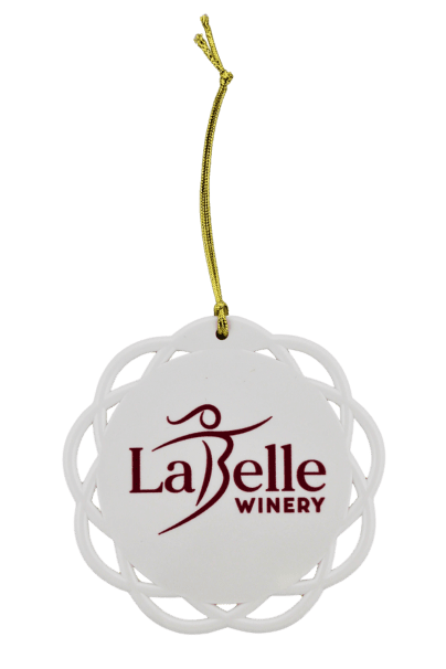 - Circular white plastic ornament featuring the maroon LaBelle Winery logo